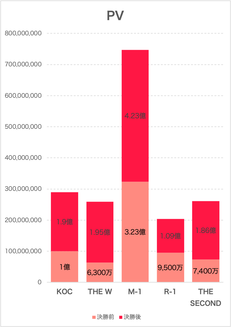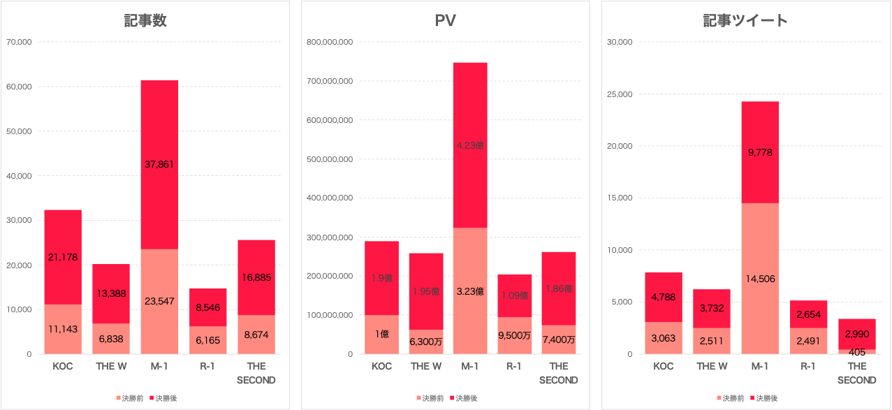 ・記事数とPV数の規模においては、THE SECONDは1位のM-1、2位のキングオブコントを追う立ち位置。