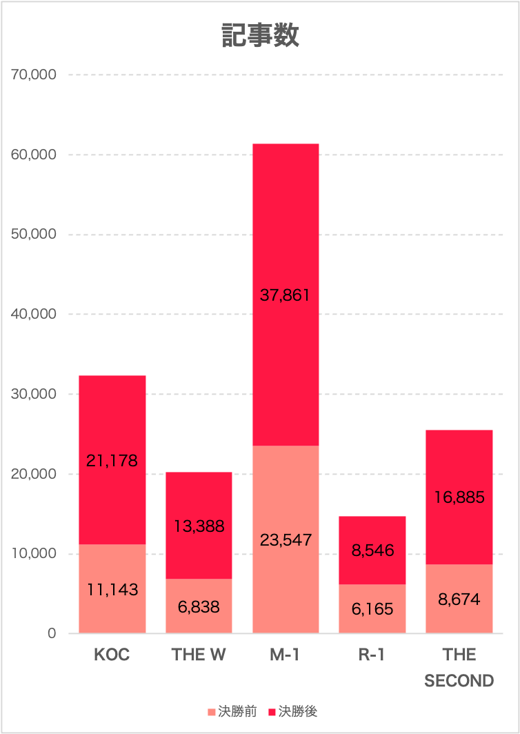 直近の「M-1グランプリ」・「キングオブコント」・「R-1グランプリ」・「THE W」と「THE SECOND」との間で、決勝戦前後の1ヶ月のウェブニュースを比較分析しました。