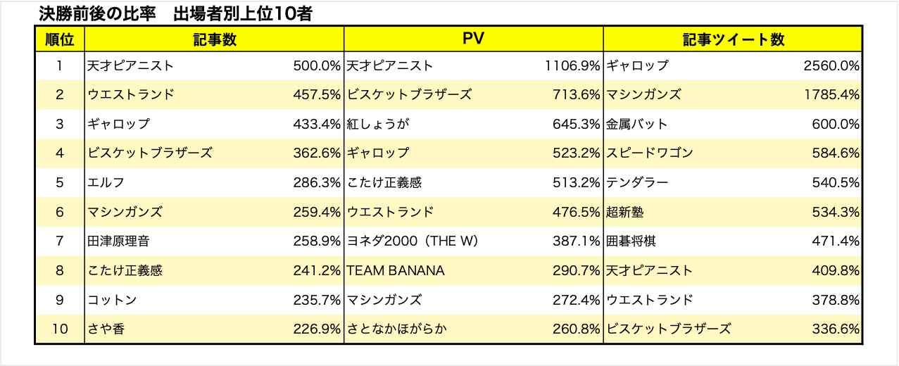 - THE SECOND決勝出場者の記事数とPVは3位、記事ツイート数は5位。