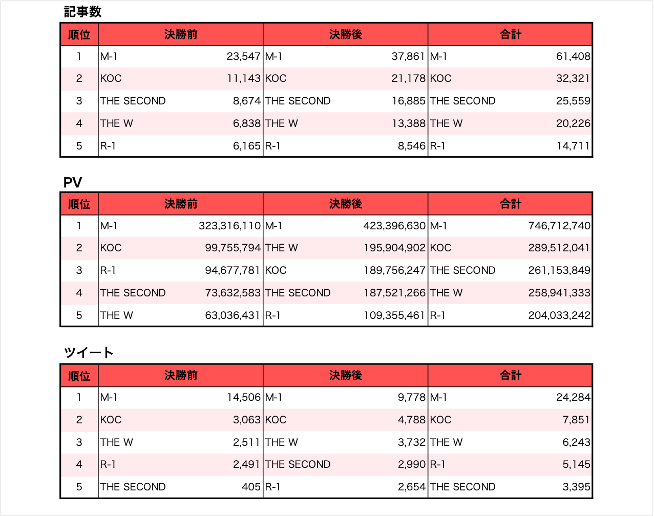 - 記事数とPVの規模では、THE SECONDは1位M-1、2位キングオブコントを追う立ち位置。