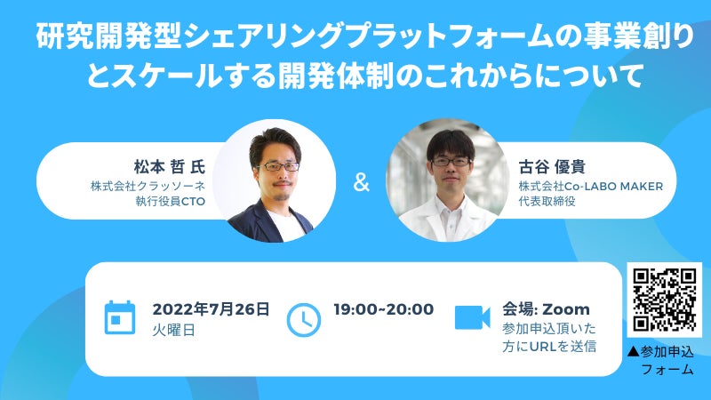 このたび松本氏の技術顧問就任を記念して、7/26(火)19:00よりオンラインイベント「研究開発型シェアリングプラットフォームの事業創りとスケールする開発体制のこれからについて」を開催いたします。本イベントでは、当社の事業モデルやプロダクトの特性、当社における技術開発等について松本氏と当社代表古谷が対談します。ご興味をお持ちいただけましたら、参加申込フォーム(https://forms.gle/bLJPmGr3woCiXknq5 )よりお申し込みください。