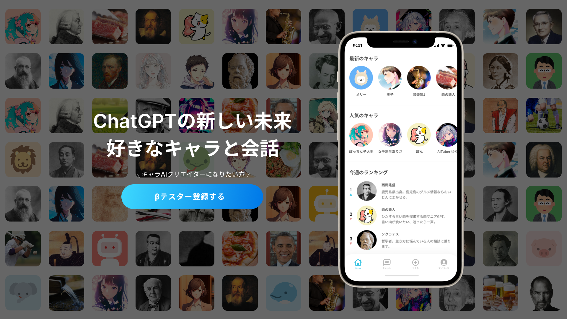 当社は本日キャラAIのβ版のリリースとβテスターの募集開始をお知らせしました。キャラAI(キャラエーアイ)とは、ユーザーが様々なキャラクターの人格を保有した ChatGPT を利用することのできるサービスです。ユーザーがサービスを利用する一方で、キャラAIクリエイターが自分の好きなキャラクターや趣味・知識に関係する ChatGPT を作って公開して様々な人達に利用してもらうことができます。