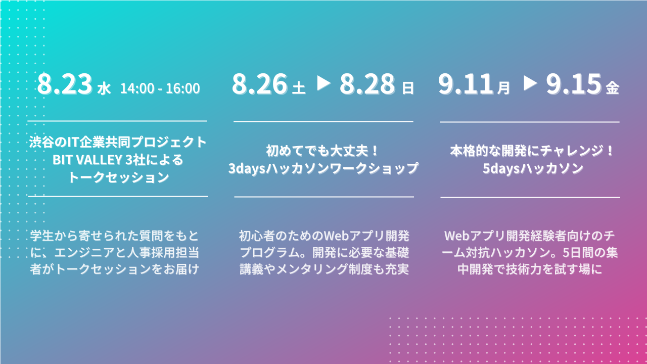 トークセッション 2023年8月23日(水) サイバーエージェント・DeNA・MIXIの若手エンジニアと人事採用担当者がトークセッションをお届けします。学生から寄せられた質問をもとに、Web業界で働く実態、またそれぞれのキャリアを振り返るお話をします。 (定員1,000名 先着順) 3days ハッカソンワークショップ 2023年8月26日(土)〜 8月28日(月) Web開発の初学者を対象に、3日間のハッカソンワークショップを開催します。開発に必要な基礎講義や専属のメンター制度を設けており、初めてでも安心してチャレンジしていただくことが可能です。 (定員50名 定員を超えた場合は抽選) 5daysハッカソン 2023年9月11日(月)〜 9月15日(金) Webアプリケーションの開発経験者を対象に、5日間のチーム対抗ハッカソンを開催します。サイバーエージェント・DeNA・MIXIのエンジニアが審査員として参加し、学生に技術力を試す場を提供します。 (定員100名 定員を超えた場合は抽選) |