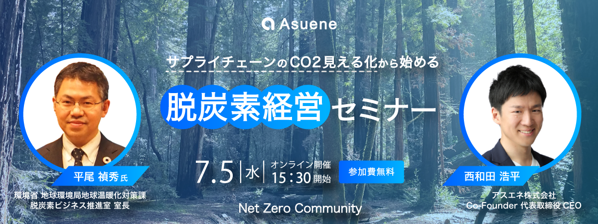 昨今、業界や企業の規模に関わらず、サプライチェーン全体でのCO2排出量削減や脱炭素経営が求められるようになってきました。具体的にどのように取り組めば良いのか?Scope3にどう対応すべきか?脱炭素経営にはどのようなメリットがあるのか、などの声が大手・中小企業のお客さまから増えています。 本セミナーでは、当社代表の西和田とともに、環境省 脱炭素ビジネス推進室 室長の平尾氏をお招きし、脱炭素経営が必要とされている背景やメリット、支援体制などを事例とともに解説します。脱炭素経営の理解を深め、アクションにつながるヒントをお届けします。