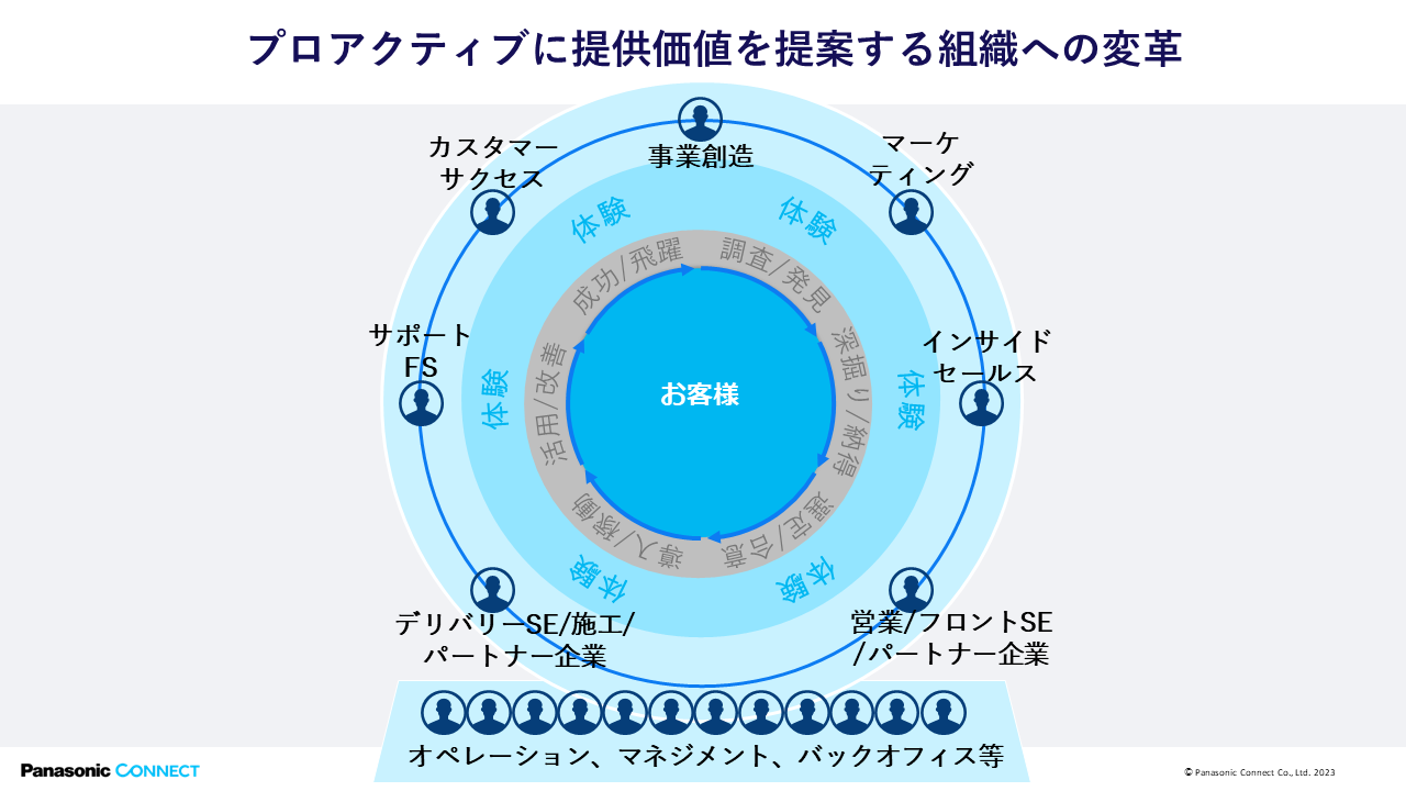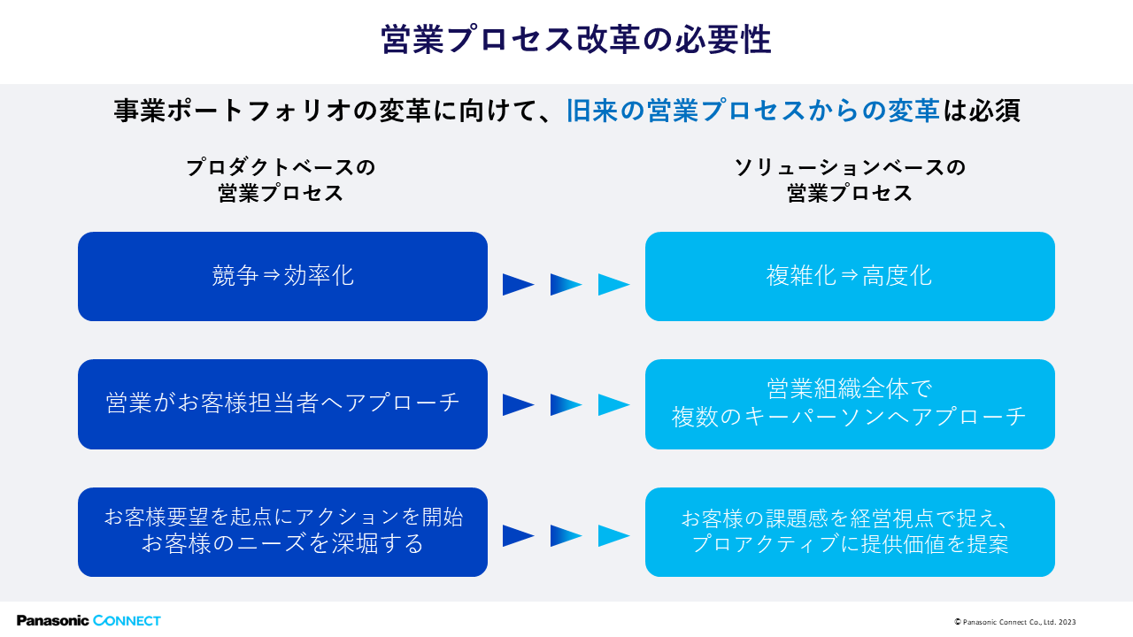 パナソニック コネクトの社内カンパニーである現場ソリューションカンパニー(プレジデント:奥村 康彦、所属の従業員数:2023年4月現在、約4,150名)では、パナソニック コネクトの「プロダクトベース」から「ソリューションベース」の事業ポートフォリオ変革に向けて、営業プロセスにおいても、ハードウェアを単体で提供する従来の「プロダクトベース」の営業プロセスから、複数のハードウェアとソフトウェアも組み合わせた「ソリューションベース」の営業プロセスへのトランスフォーメーションに取り組んでいます。