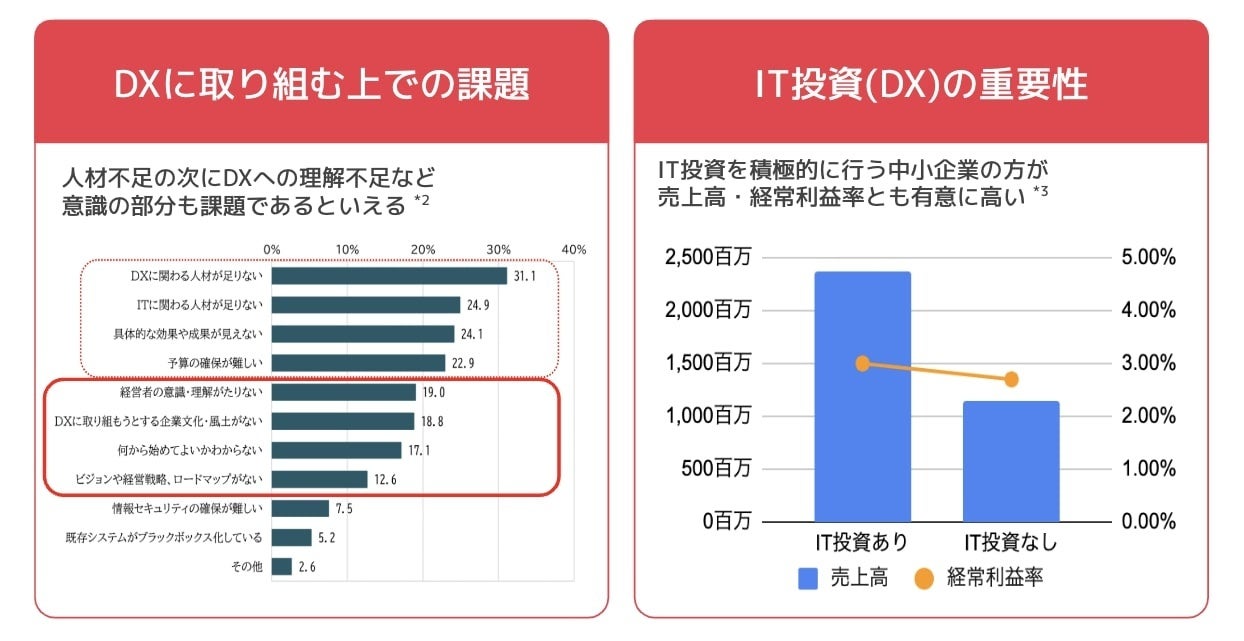 特に、日本企業の99.7%を占める中小企業における生産性向上は急務の課題です。その中で、DXに取り組む上での課題として、DXに関する人材不足が一番の要因としてあげられ、その次にDXへの理解不足や何から始めてよいかわからないなど、”意識や認識の部分”も課題となっています。(*2)