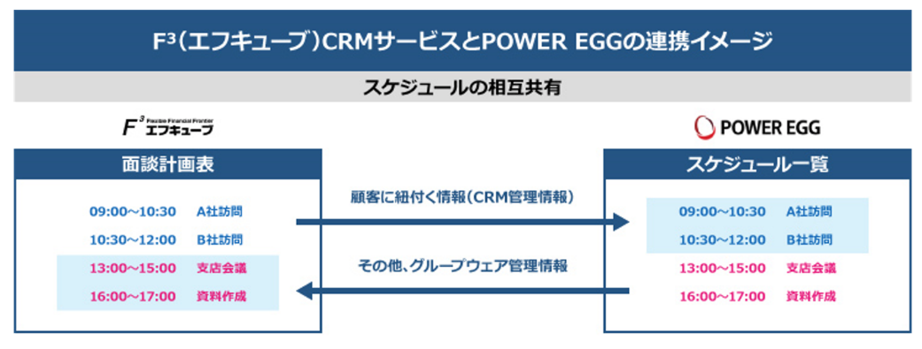 「F³CRMサービス」と「POWER EGG」の双方で登録した行内スケジュールや面談計画を連携することが可能です。「F³CRMサービス」の面談計画表と「POWER EGG」のスケジュール一覧を相互共有することで、二重登録の解消や登録誤りを防止し、業務効率化を実現します。