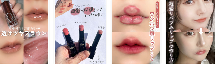 一方、アフターコロナではマスクを取る機会が増えてきたことから、マスクで隠れていたリップに重点を置くメイクやリップアイテムの紹介投稿が人気に。コロナ禍ではマスクにつかないリップの投稿の需要が高かまったが、今はツヤ感の出るリップや、リップをふっくら見せるためのメイクが人気となり、「粘膜リップ」というワードがバズワードに。全体的にコロナ禍よりもリップで主張するメイク、リップアイテムが人気の傾向となっている。
