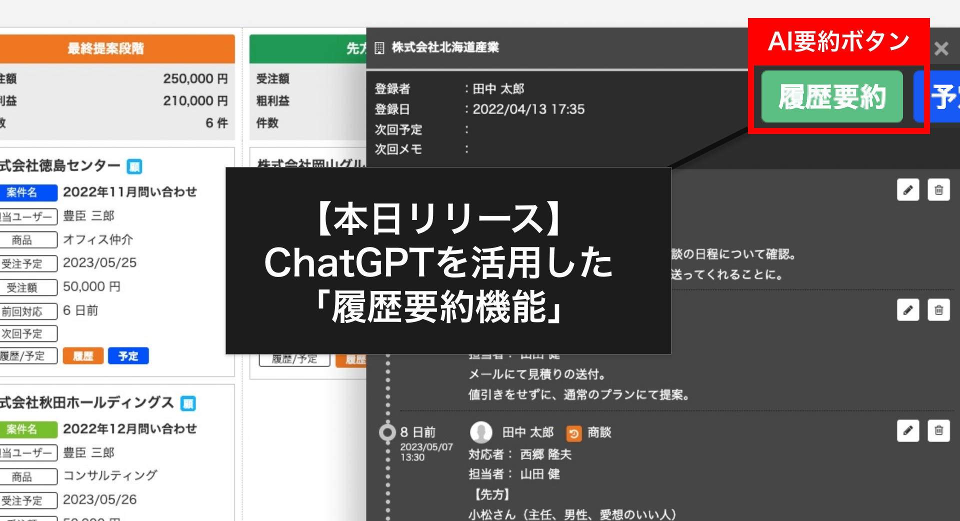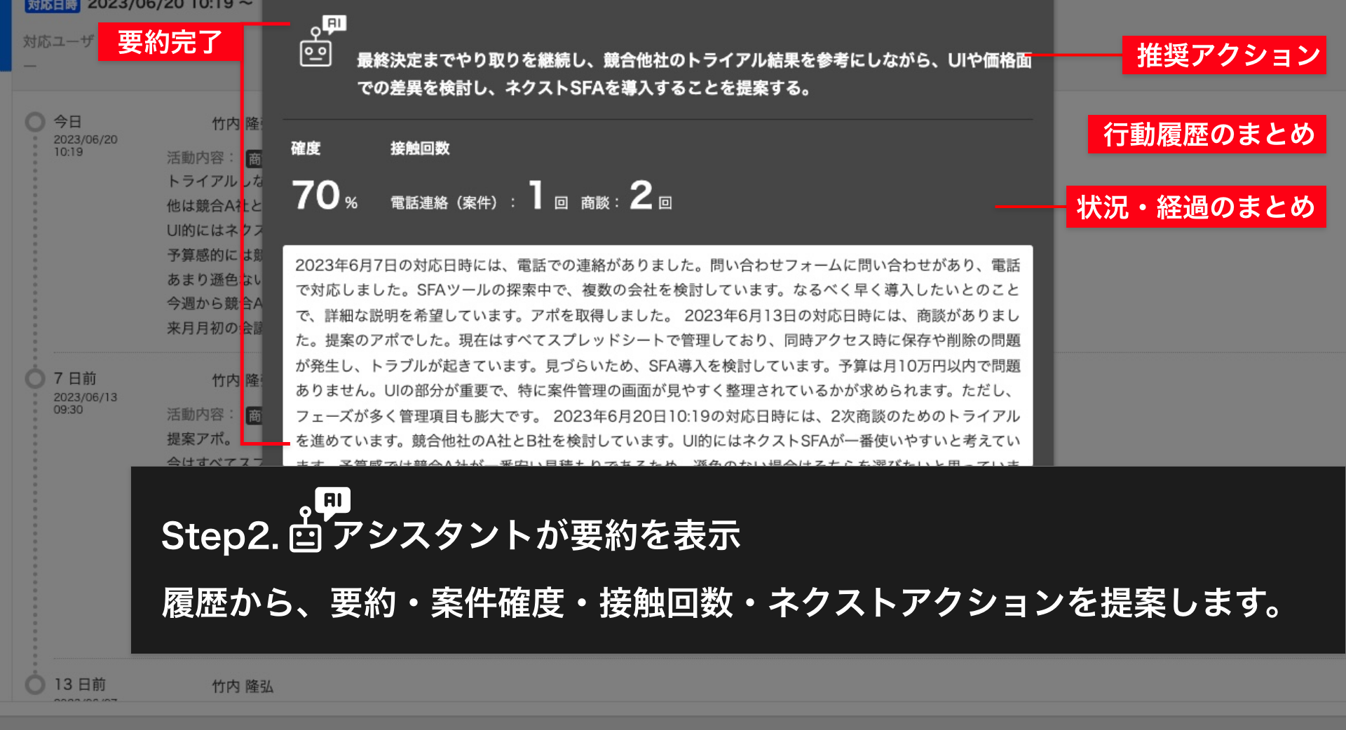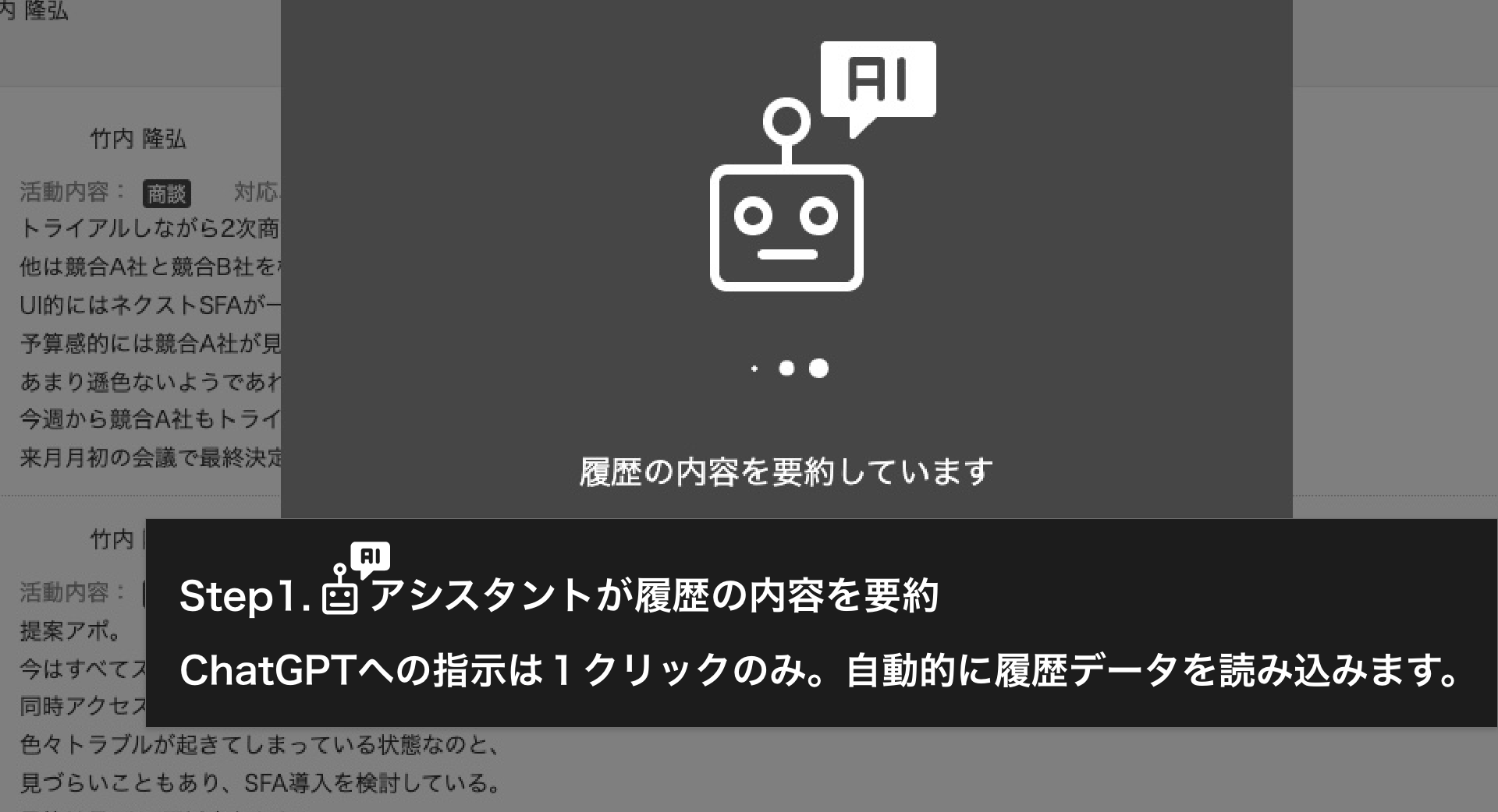 「履歴要約機能」は、ネクストSFA内で管理されている顧客との通話内容、商談履歴、メール履歴などの対応履歴をChatGPTで要約できる機能です。AIを初めて使う方でも簡単に人工知能の利点を最大限に活用することができます。