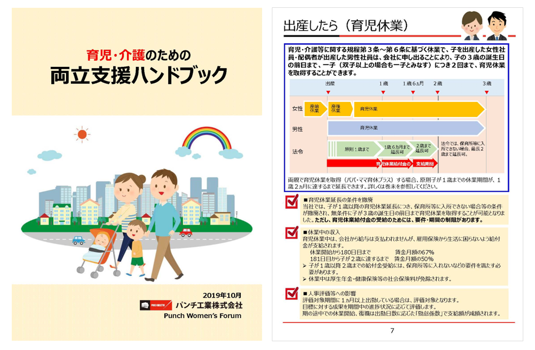 2024 年度には対象となる男性社員の育児休業・育児休暇取得率30%以上という目標を掲げていますが、2023年3月末時点で既に目標を大きく上回り、100%(※)に達しています。取得日数・回数の増加や有意義な育児期間とするなど、より質の高い育児休業・休暇の取得に向け、制度をまとめたハンドブックを作成し、社員に配布することで制度の認知を進めています。また、社内報でも定期的に取得者の体験記を掲載し、職場での理解向上を図っています。