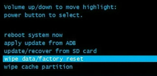 Step3:音量「―」ボタンを押して、「Wipe data/factory reset」を選択して、電源ボタンを押します。
