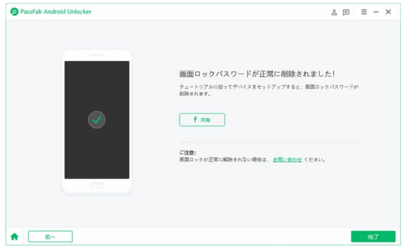 Step5:しばらく待つと、Androidのロック画面のパスワードが削除されます。「完了」をクリックして終了します。