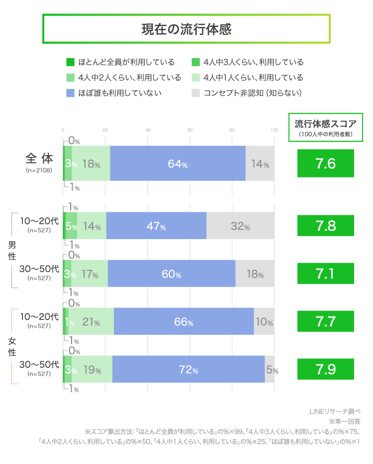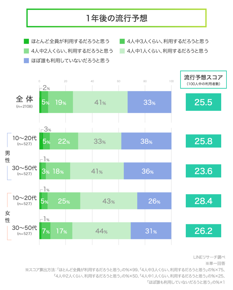 「1年後、自分のまわりでどのくらいの人が利用していると思うか」を想像して答えてもらいました。 グラフにある流行予想スコアは、100人中どのくらいの人が1年後に利用していそうかを算出した数値です。