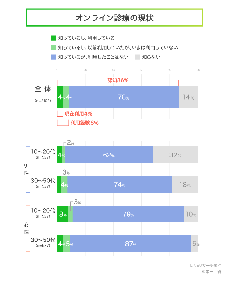 ここまでの主な数値をまとめてみました。2023年5月22日時点、「オンライン診療」の認知率は86%で、現在利用率は4%でした。