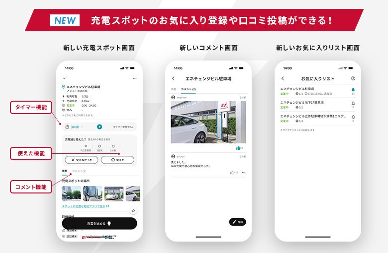 EVsmartで好評だった「記録」の機能が加わり、気軽に利用報告ができる「使えた」「使えなかった」の評価ボタンやコメント機能の他、お気に入りスポットの登録が利用できます。また、EVsmartアプリでマイリストに追加したお気に入りの充電スポットはアプリ統合の2023年6月28日以降のアップデートを実行後、再ログインしていただくことで、データの引継ぎが完了します。