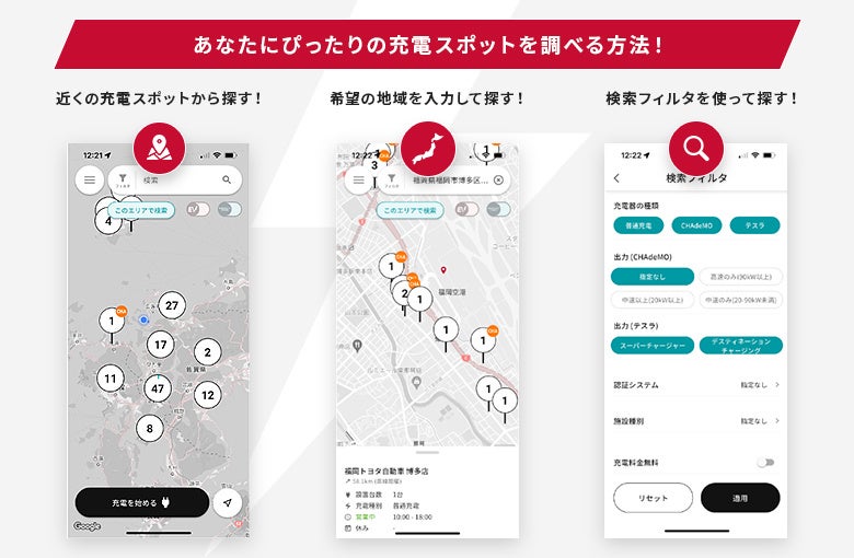 2023年6月28日(水)のアプリ統合により生まれ変わる「EV充電エネチェンジ」アプリでは、主に「全国の充電スポットの検索」「導入台数NO.1(※2)のエネチェンジの6㎾普通充電器の充電」「稼働状況の口コミを記録」の3つの機能が1つのアプリでできるようになります。充電スポットの検索については、現在地周辺や指定住所で充電スポットが探せるほか、充電器の種類や出力などの条件を絞って調べることができ、日常使いに加え旅行計画を立てる上でも役立ちます。