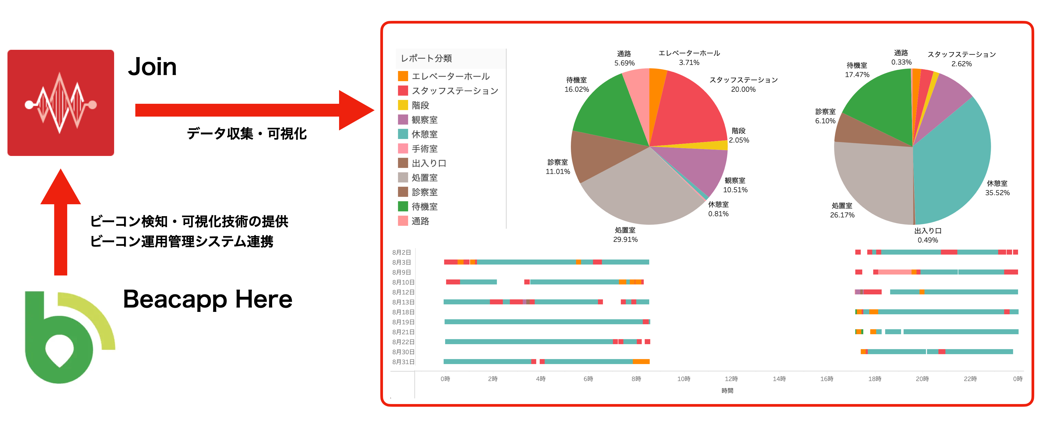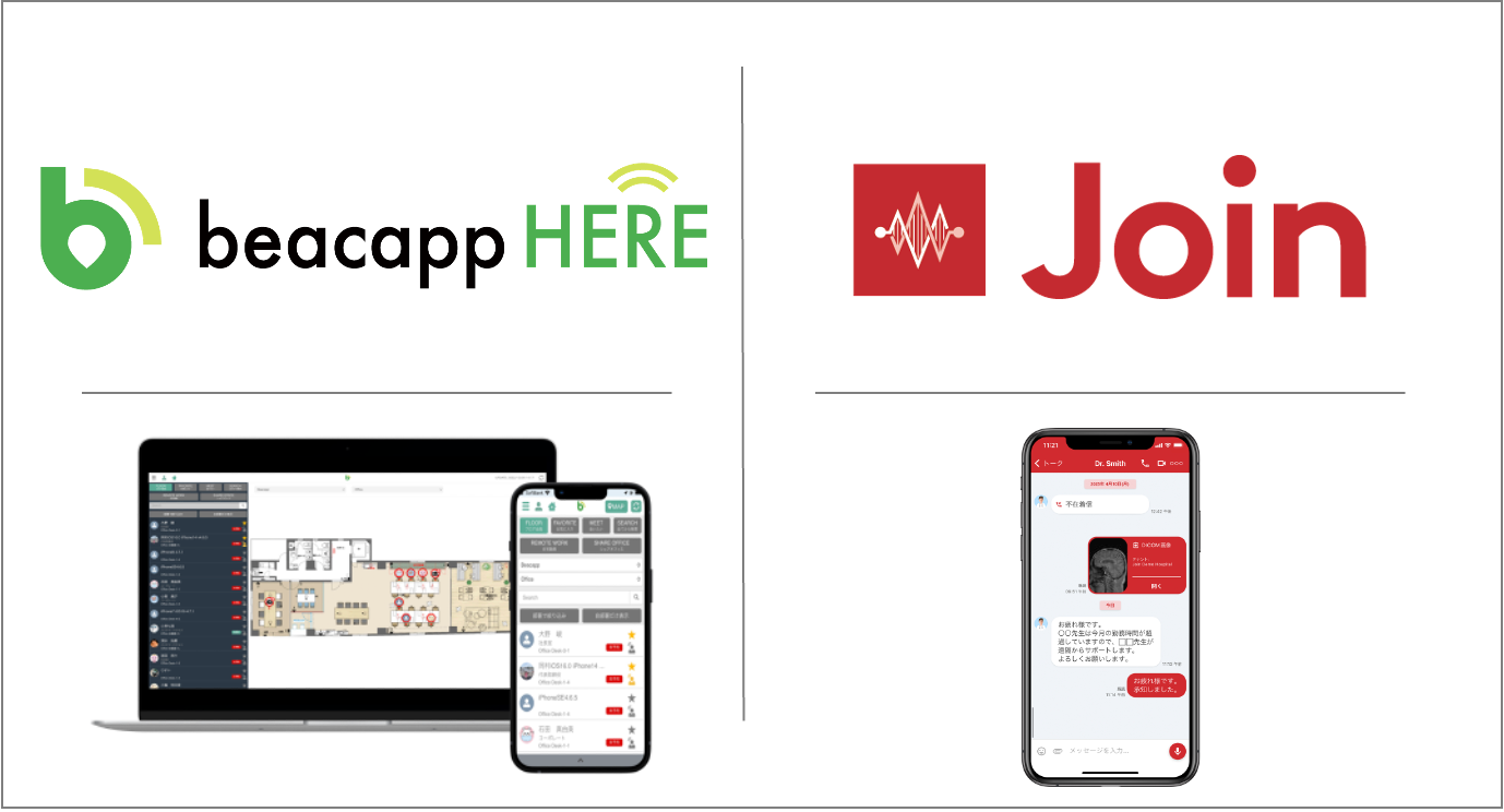 Join Workは、病院内の主要な場所(医局、入り口、手術室等)にビーコン(電波を発する小さいデバイス)を設置し、Joinアプリがビーコンを検知することで、Becapp Hereサーバーにスタッフ・医療機器の位置情報を記録します。Becapp Hereサーバーに蓄積されたデータをJoinアプリ・Join Web(ブラウザ)からヒトやモノの居場所・働き方をリアルタイムに把握することができます。GPSとは異なり病院内のみの位置情報を把握するために、プライバシーの懸念もありません。さらには、Joinのコミュニケーション機能で、超過勤務が検知された場合に指示を出すことや、遠隔からの診療支援や業務をサポートします。これにより、医療DXによる勤務実態把握と働き方改革を実現します。