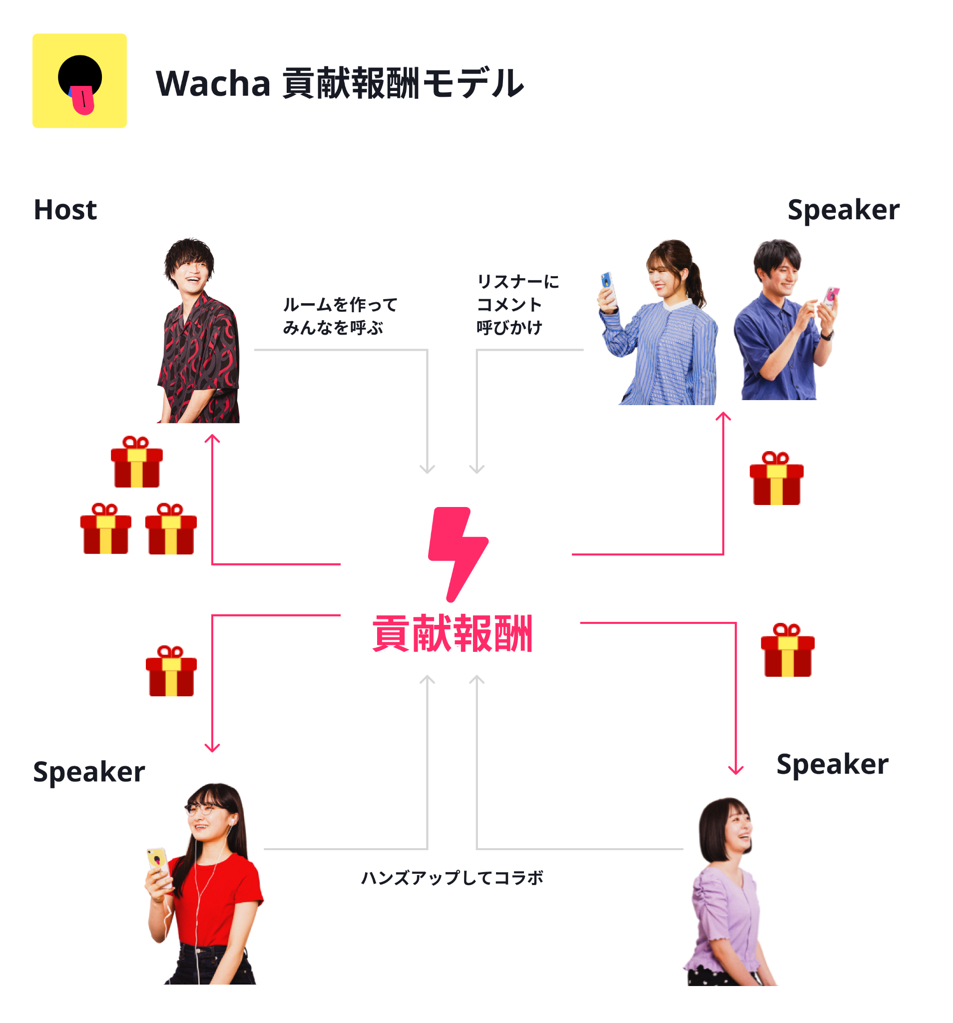「貢献報酬」のシステムとは、独自のアルゴリズムに基づいて提示された「盛り上がり指数」に応じ、リスナーやスピーカーから投げられたギフトの報酬を、ホストだけでなく配信に貢献したスピーカーにも分配する仕組みです。