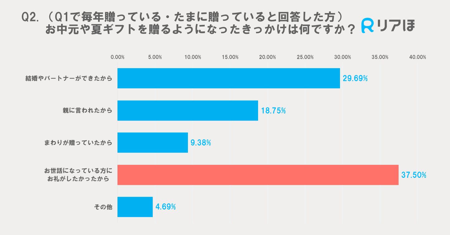Q1で「毎年贈っている」「たまに贈っている」と回答した方に、お中元や夏ギフトを贈るようになったきっかけを質問したところ、「お世話になっている方にお礼がしたかったから」が最も多く37.5%、次いで「結婚やパートナーができたから」が29.69%となりました。