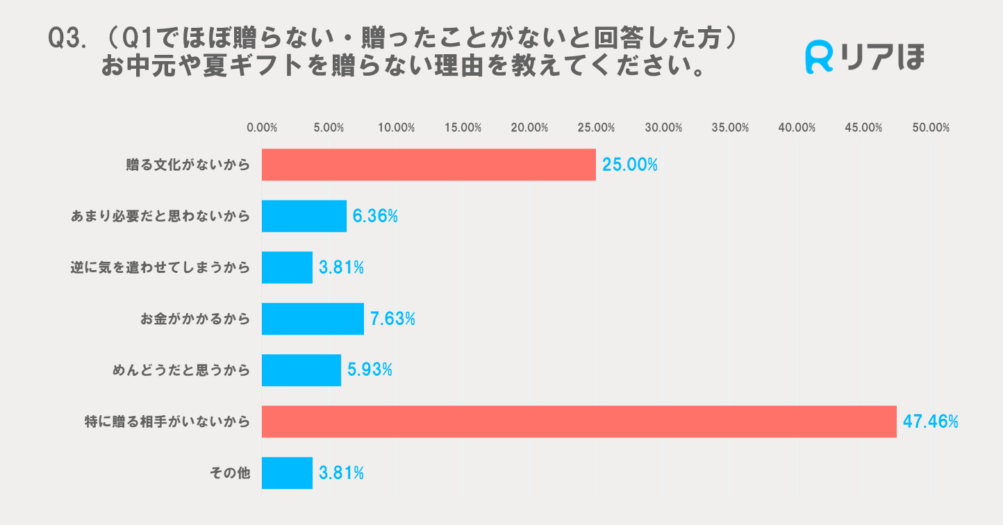 Q1で「ほぼ贈らない」「贈ったことがない」と回答した方に、その理由を質問したところ、「特に贈る相手がいないから」が最も多く47.46%、次いで「贈る文化がないから」が25%となり、まわりも贈らないもしくは、自分自身もお中元を受け取っていないような状況がうかがえました。
