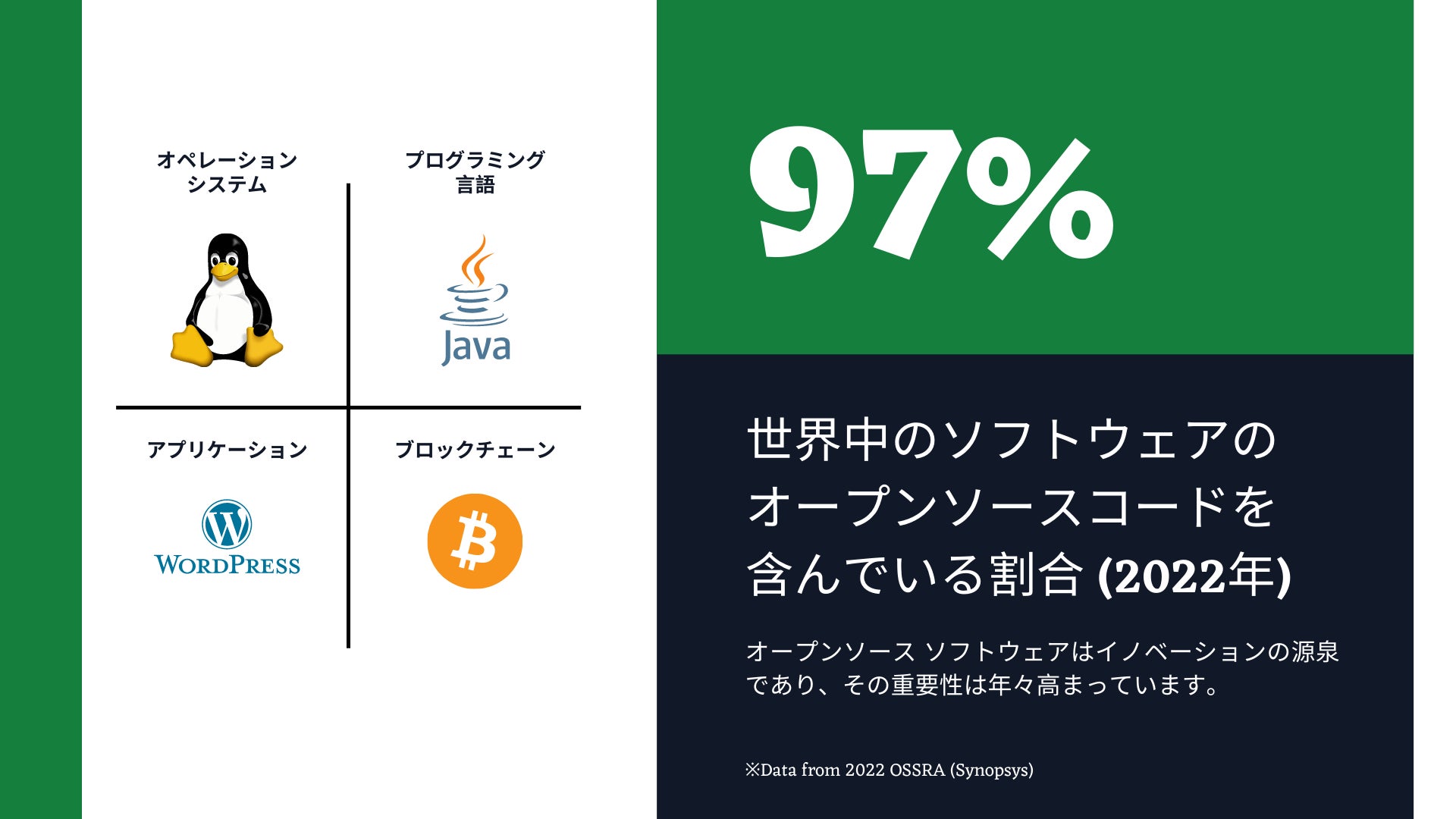 2022 年には全世界のソフトウェアの 97%がオープンソースコードを含んでおり、90%の企業がオープンソースソフトウェアをビジネスに活用しています (2022 Synopsys: OSSRA, 2022 GitHub: Octoverse, The state of open source software)。オープンソースソフトウェアは誰でも自由に無料で使うことができ、世界中の開発者によって開発・改善されるため品質が高いので、オープンソースコードを組み合わせて自社ビジネスのソフトウェアを開発するのが主流となっています。
