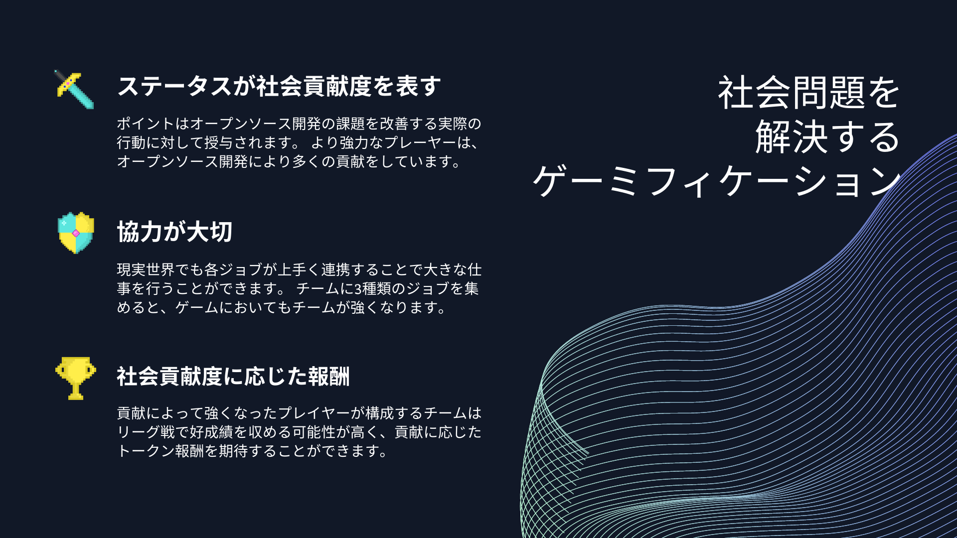 オープンソースソフトウェア開発の深刻なリソース不足という実社会の問題に紐づいたゲームプラットフォームを開発することで、開発者・投資家・広報活動家どの立場にもインセンティブがあり、それぞれが楽しさとインセンティブを求め実際に行動することでその社会問題が解決されていきます。