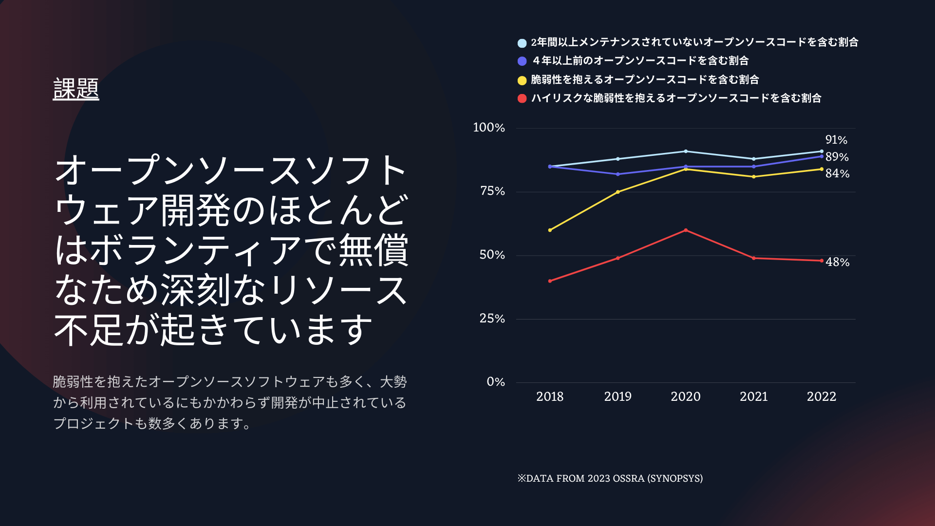 現代のイノベーションの核となっているオープンソースソフトウェアですが、その開発環境は課題を抱えています。2010 年には 10%だった「すべてのコードベースにおけるオープンソースソフトウェアの割合」は 2022 年には 78% (2022 Synopsys: OSSRA)と、約 10 年で 8 倍と急激に増加しました。それに伴ってオープンソースソフトウェアの開発及び管理コストも増え続けているにも関わらず、それらは未だに熱心な開発者によるボランティアによって無償で行われています。