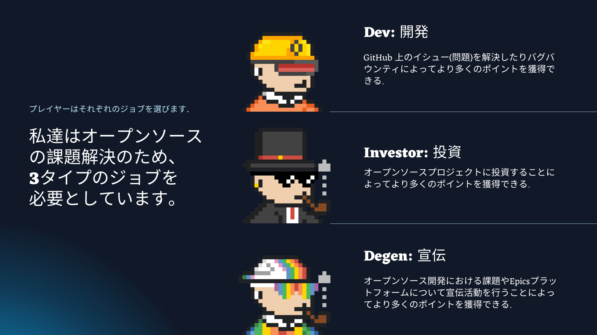 オープンソースソフトウェア開発には大きく分けて 3 つの足りないリソースがあります。開発リソースと資金、そしてこの問題に対する認知です。Epics のプレイヤーは Dev(開発)、Investor(投資家)、Degen(広報)という 3 つのジョブから一つを選び、それぞれ対応する行動を取る(開発・投資・PR)ことで多くのポイントを獲得できます。