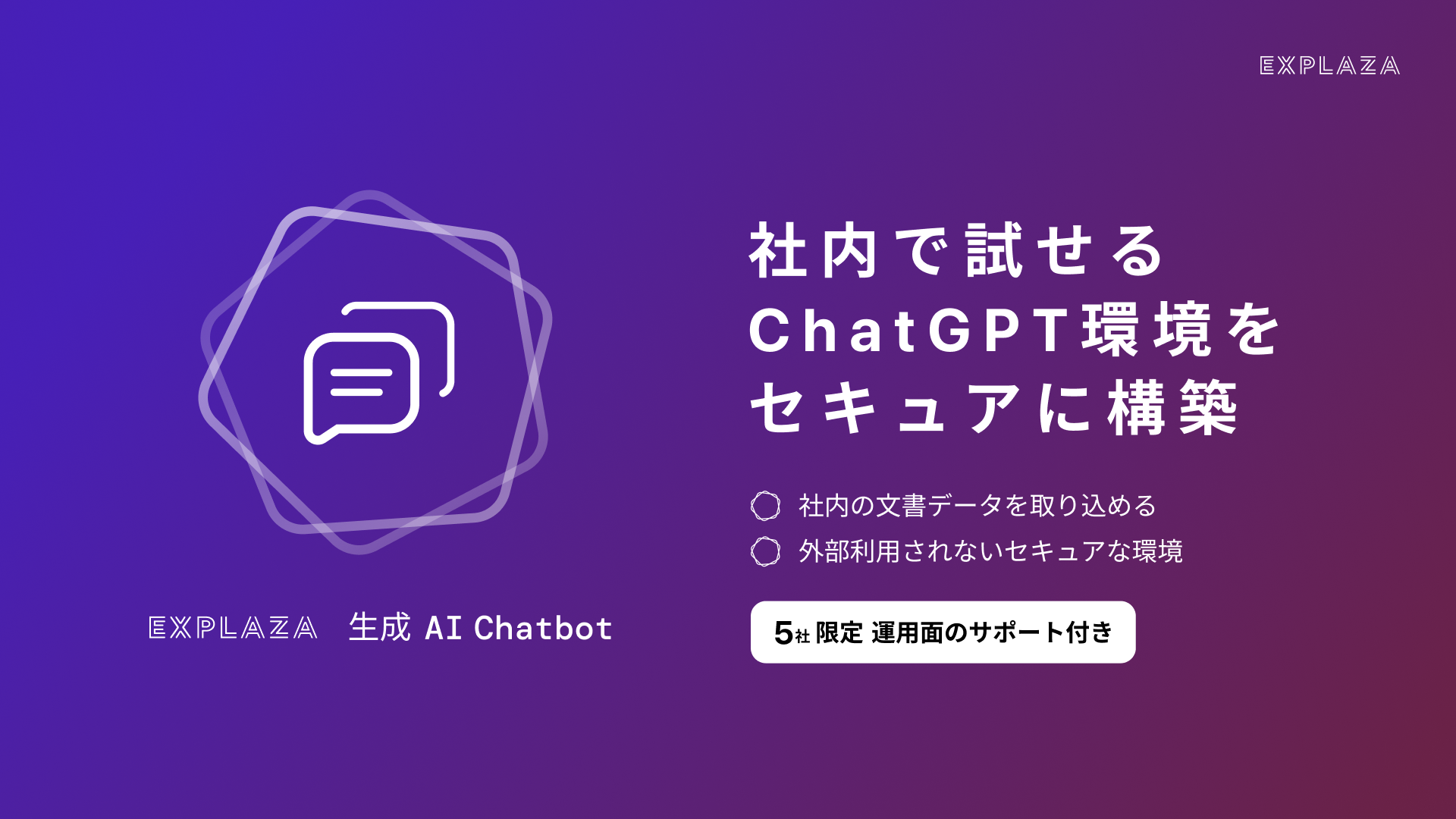 そこでエクスプラザは各企業様における生成AI導入の良きパートナーとして、まずは取り組みやすいChatbotを対象に、セキュアな環境を手軽に導入でき手触り感を持ってChatGPT活用を始められるサービスの提供を始めました。
