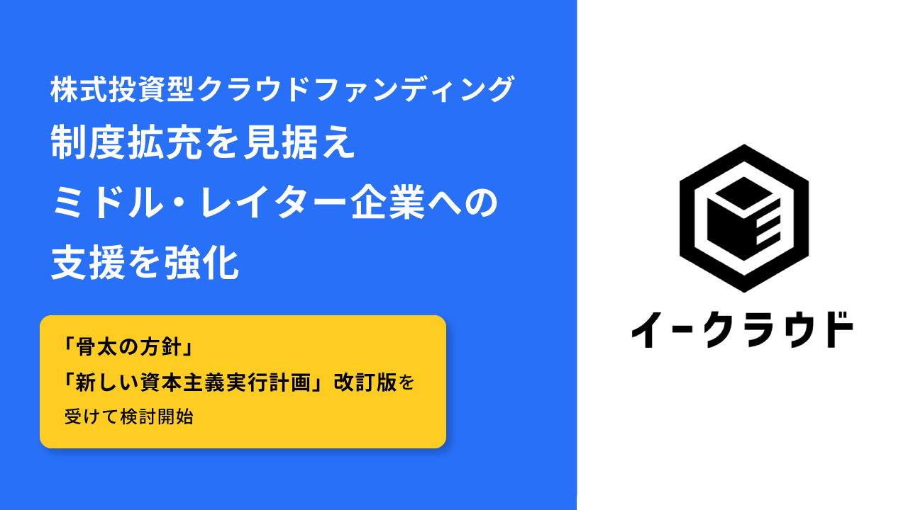 イークラウドでは株式投資型クラウドファンディングの拡充に向けた法整備などを見据え、ミドル期・レイター期のスタートアップに対する施策強化の検討を開始します。