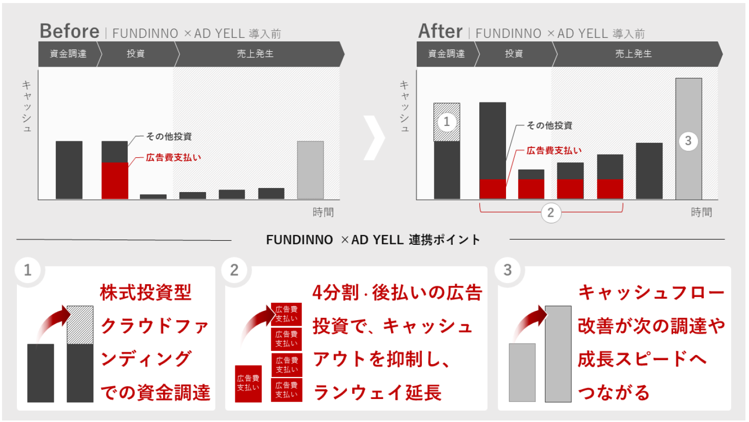 本協業による連携で、両社の顧客に対して、双方のサービスを必要なタイミングでタイムラグなく提供することが可能となります。これまでバンカブルが支援することができなかった「広告投資前に財務状況の改善が必要な企業」へ、FUNDINNOでの資金調達によるサポートを行います。そして、FUNDINNOが支援することができなかった「資金調達後のキャッシュフローを圧迫しない効率的な資金運用のサポートを必要とする企業」に対して、AD YELLによるキャッシュフロー圧迫解消をサポートいたします。これにより、スタートアップ・ベンチャー企業の成長を阻む「財務課題」の解決と、事業成長スピードを加速に向けてシナジーを発揮してまいります。