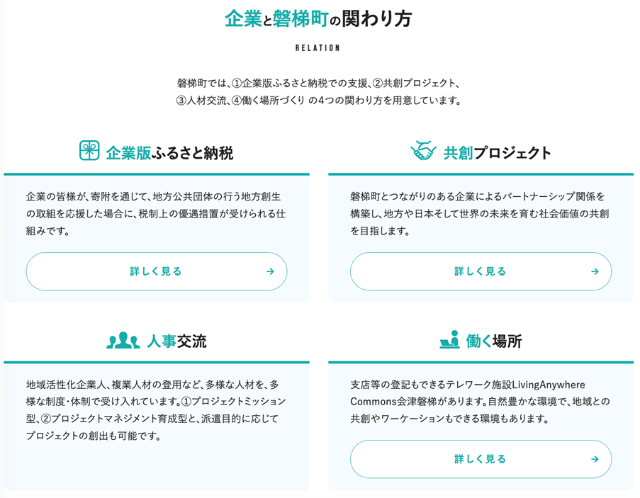 磐梯町では、「誰もが自分らしく生きられる共生社会の共創」を掲げ、官民が連携しやすい場所づくり・仕組みづくりを進めています。企業との連携協定、町外からの複業人材の登用、役場外の民間施設にも町の拠点を構えるなどを行ってきました。現在、町では、企業の方に向けて、(1)企業版ふるさと納税での支援、(2)共創プロジェクト、(3)人材交流、(4)働く場所づくり、の4つの関わり方を用意しています。そこで、企業の皆さんが関わり方についてイメージを掴んでいただけるように、本サイトの開設に至りました。