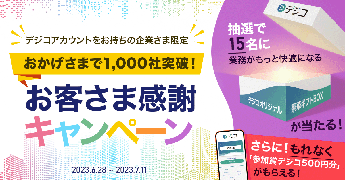デジコは、たくさんの企業さまにサービスをご利用いただいたおかげで、2023年6月に導入企業数1,000社突破いたしました。多くの皆さまからのご支援を賜り、心より感謝申し上げます。今回、累計1,000社という多くの企業さまのご愛顧に感謝して、「おかげさまで1,000社突破!お客さま感謝キャンペーン」を実施いたします。