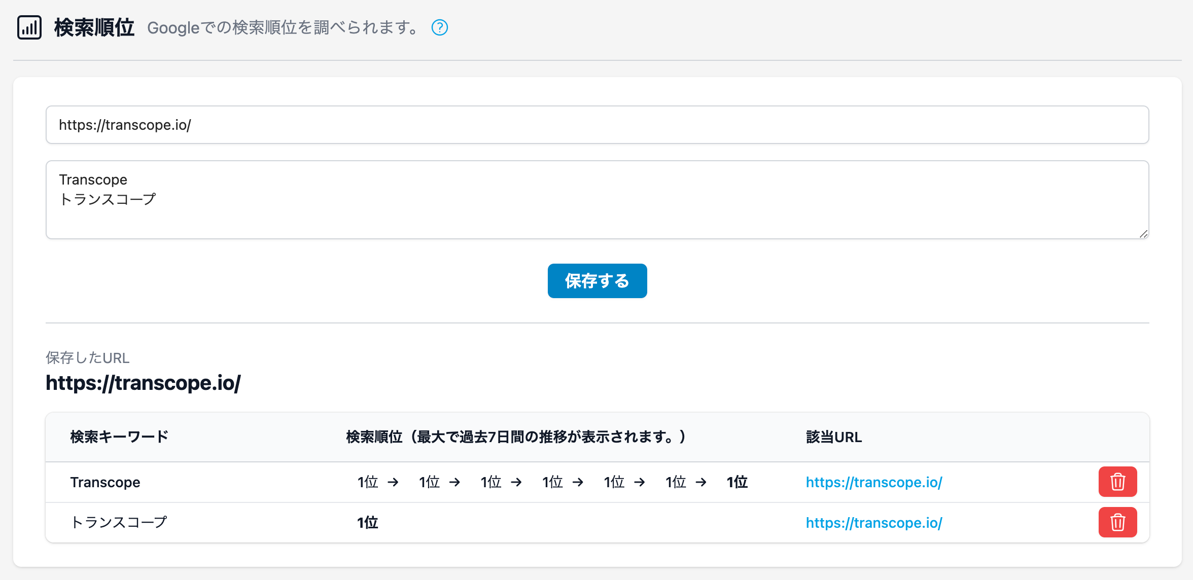 Transcopeの[検索順位]メニューから、検索順位を調べたいページのURLとキーワードをご入力いただくことで、検索順位を調べることが可能です。検索順位は最初の情報入力時に順位を取得した後、1日1回最新の順位が追加されます。(太字の順位が最新の順位です。)