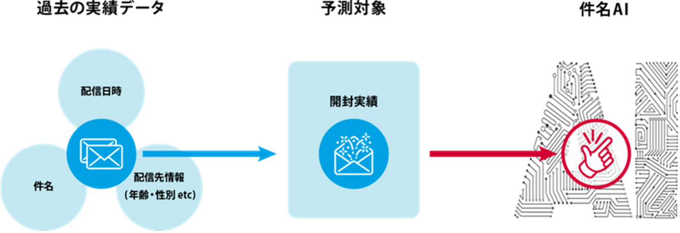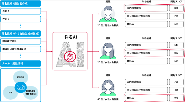 配信対象ユーザーごとに最適な件名を判定するため、件名やユーザーの行動情報、属性情報等を基に、メールの開封結果を予測する「件名AI」を実行し、開封率の予測値を「開封スコア」として算出します。