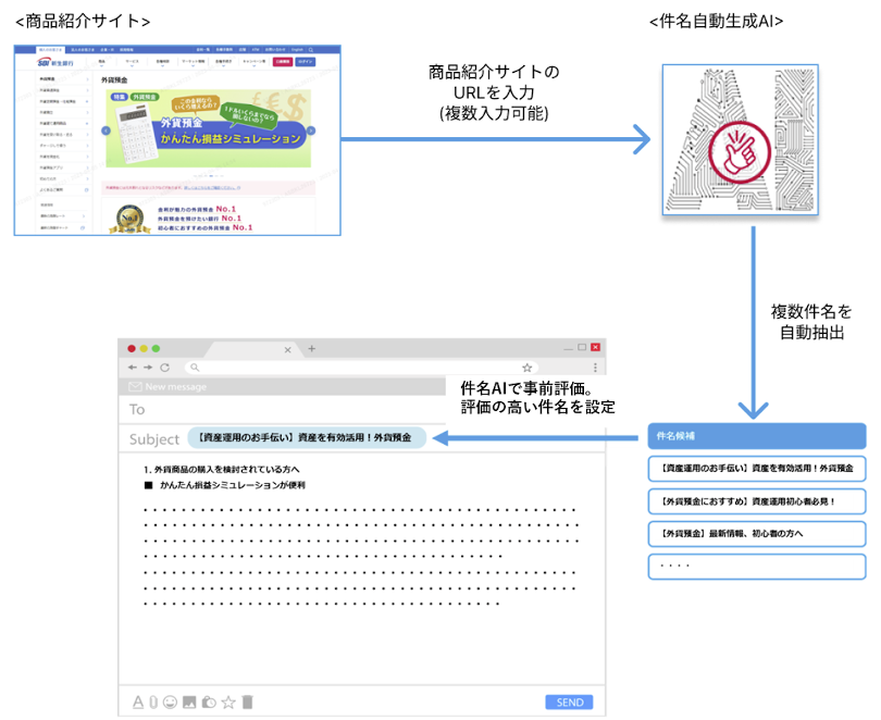 商品紹介サイトなどのコンテンツに基づき、ChatGPT(AI)などを用いて自動的に複数の件名候補を抽出します。