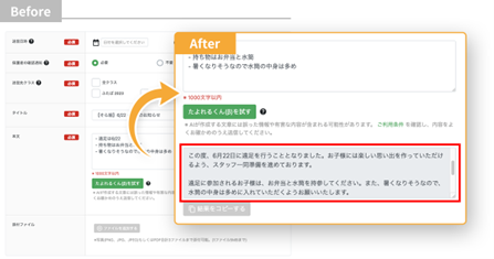 日付や活動予定、場所、持ち物等の保護者にお知らせしたい項目を箇条書きで作成します。ボタンを押すと、読み込みを開始しベースの情報を元に、保護者向けの文章を自動で生成します。文章中に誤字・脱字がある場合は校正・添削し、正しい文章を生成します。