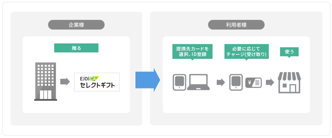 企業様は、EJOICAセレクトギフトから交換できる商品を選択した上で、ご利用者様へメール・SMS・Web画面表示・カード等さまざまな方法でプレゼントできます。