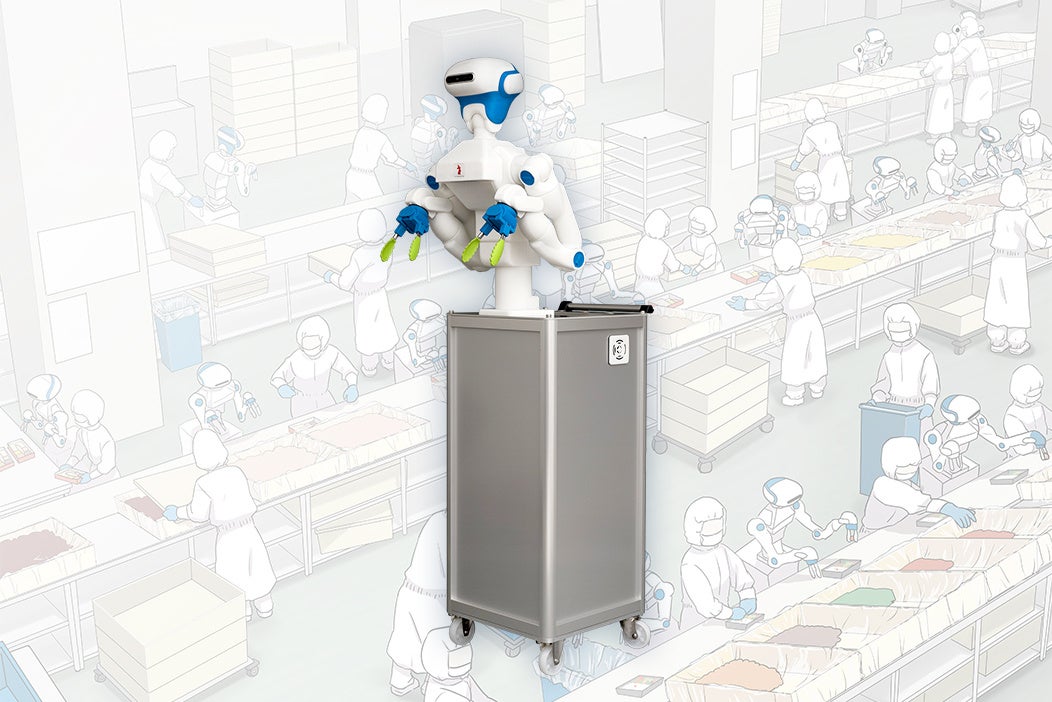 食品工場の弁当・惣菜製造ラインにおいて、独自のAIビジョンシステムによりばら積みの食材をひとつひとつ認識してピッキングし、ベルトコンベア上の容器に盛り付ける人型協働ロボットです。人ひとり分のスペースで稼働し、人と柵なしで隣り合って作業ができます。
