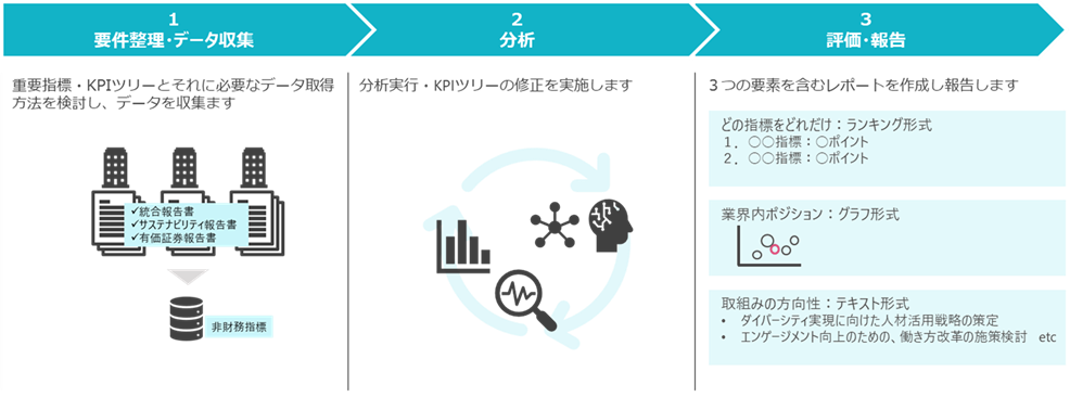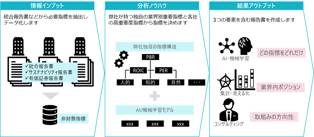 「どの指標がどれだけ効いているか」、「業界内のポジションはどこか」、「取組の方向性は何か」の3要素を含む報告書について作成いたします。