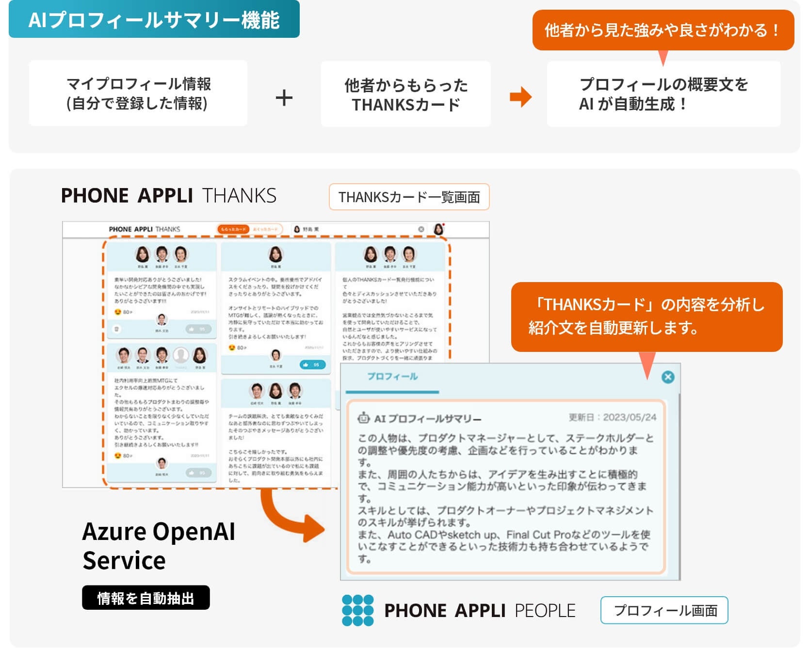 この機能は、従業員同士のTHANKSカードの情報をもとに、Azure OpenAI Service を用いて分析された「客観的な他己評価」をPHONE APPLI PEOPLEのマイプロフィールへ自動的に表示します。