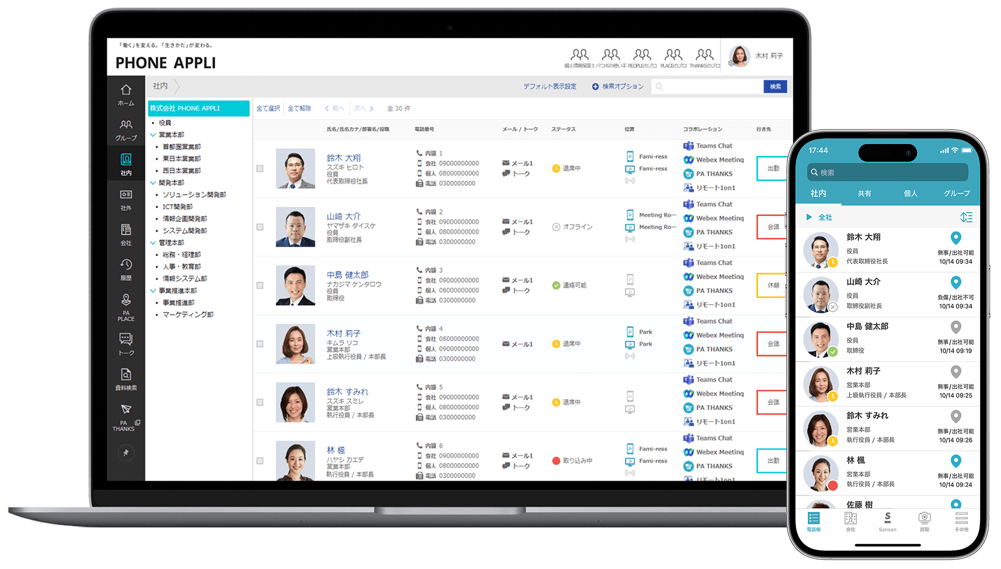 PHONE APPLI PEOPLEは、組織を強くするコミュニケーションポータルです。キーワードやスキルなどで社内の専門家を、名刺データからお客様や取引先を、それぞれ簡単に見つけだし、最適なツール(チャット、メール、電話、Web会議等)でコミュニケーションがとれ、コラボレーションを活性化させます。離れて働くことが当たり前になった時代に、「誰に相談するのが最適なのか?」を解決するサービスとして、多様な働き方の実現を目指す働き方改革推進企業様をサポートしています。