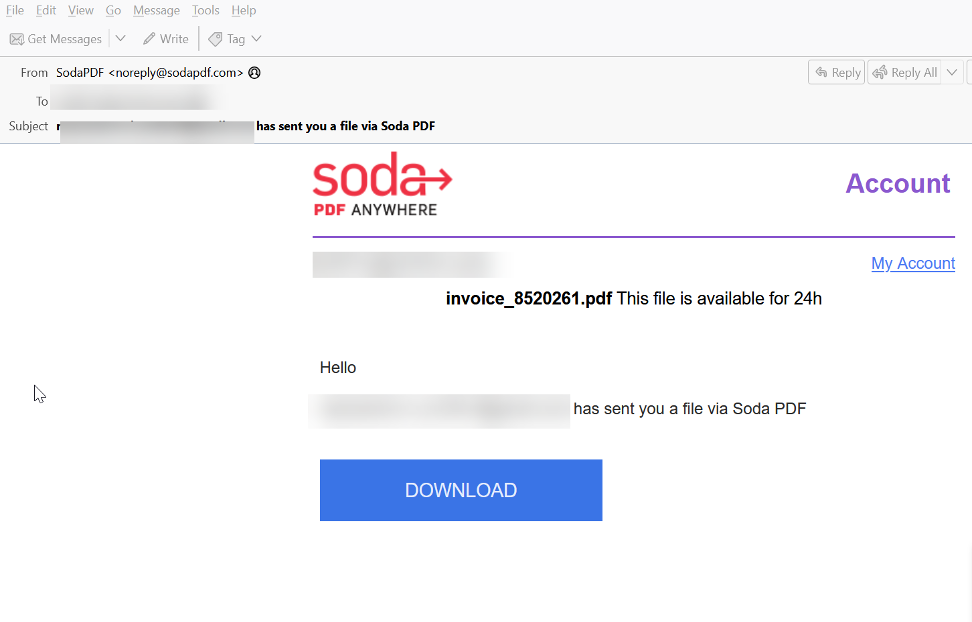 このメールは、Soda PDF経由で直接送信されています。メッセージは請求書として送信され、Soda PDFに直接つながるダウンロードリンクが貼られています。