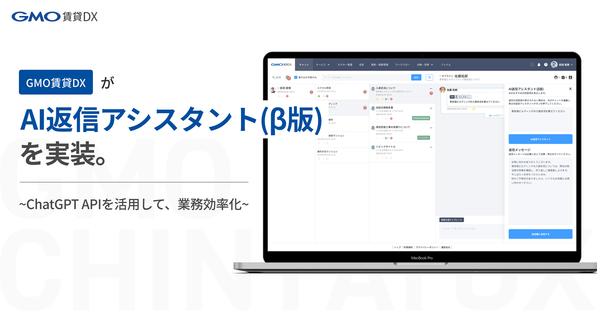 これまで「GMO賃貸DX」のチャット機能では、不動産管理会社の担当者様が文章を一から考え、オーナー様や入居者様へ送信していました。その日々の問い合わせに対して「迅速に対応したい」や「お問合せに費やす時間を短縮したい」などのご要望が、不動産管理会社様から多く寄せられたため、『AI返信アシスタント(β版)』を実装することとしました。