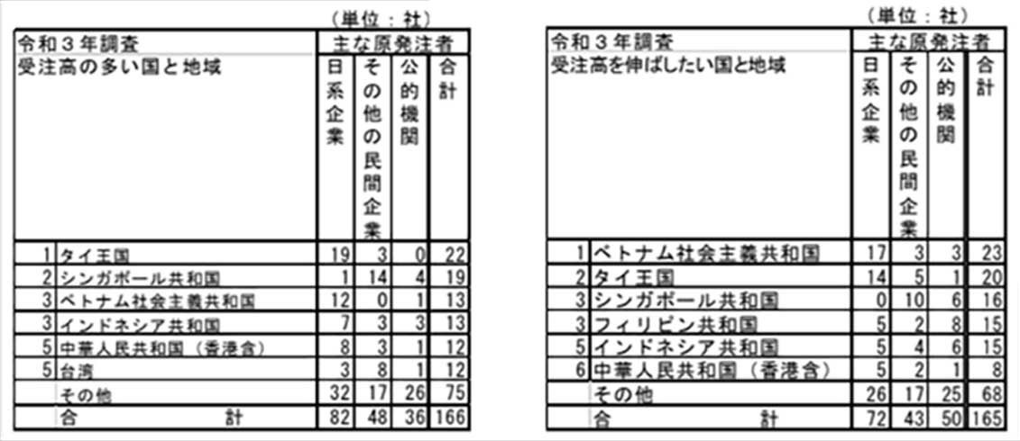 国土交通省が国内大手建設会社53社に対して行なった調査「受注高の多い国と地域」と「受注を伸ばしていきたい国と地域」では、東南アジアの国がともに上位に挙げられています。