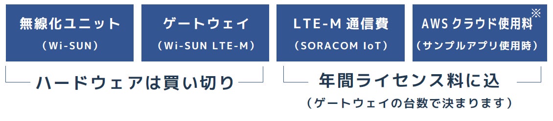 ゲートウェイには、2年分のライセンスが標準でついています。ライセンス使用料には回線契約・クラウド使用料が含まれており、サンプルアプリ使用時はAWS 使用料もライセンス料金に含まれます※。3年目以降は、ゲートウェイ1台ごとのライセンス使用料15,000円/年(税別)とわかりやすい料金体系です。
