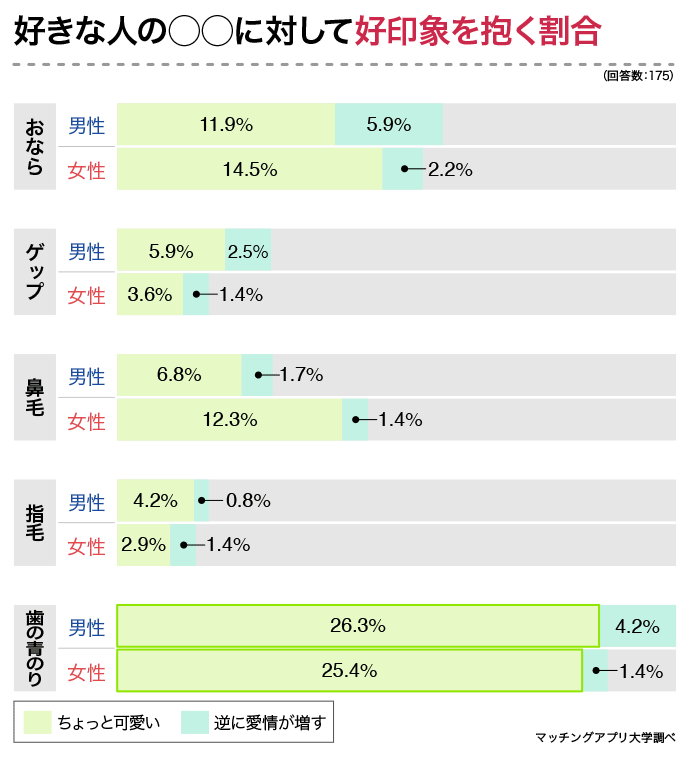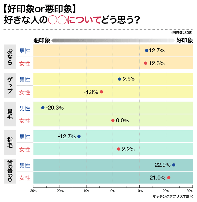 好きな人の【おなら・ゲップ・鼻毛・指毛・歯の青のり】に関しては、幻滅するどころか好意を抱くことも少なくないことがわかりました。