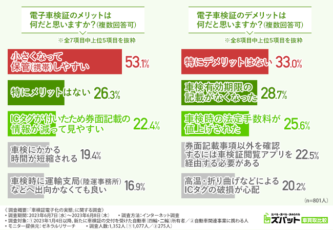 ・電子車検証の交付を受けた自動車(四輪・二輪)所有者(801人)のうち、電子車検証のメリットは「小さくなって保管(携帯)しやすい」が53.1%で最多