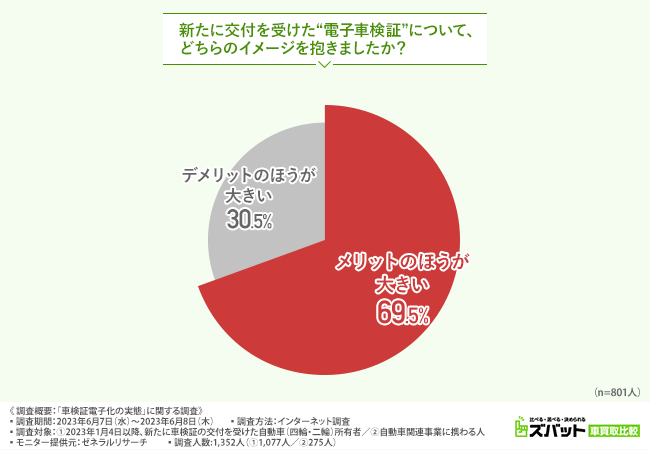「新たに交付を受けた“電子車検証”について、どちらのイメージを抱きましたか?」と質問したところ、約7割(69.5%)が「メリットのほうが大きい」と回答しました。