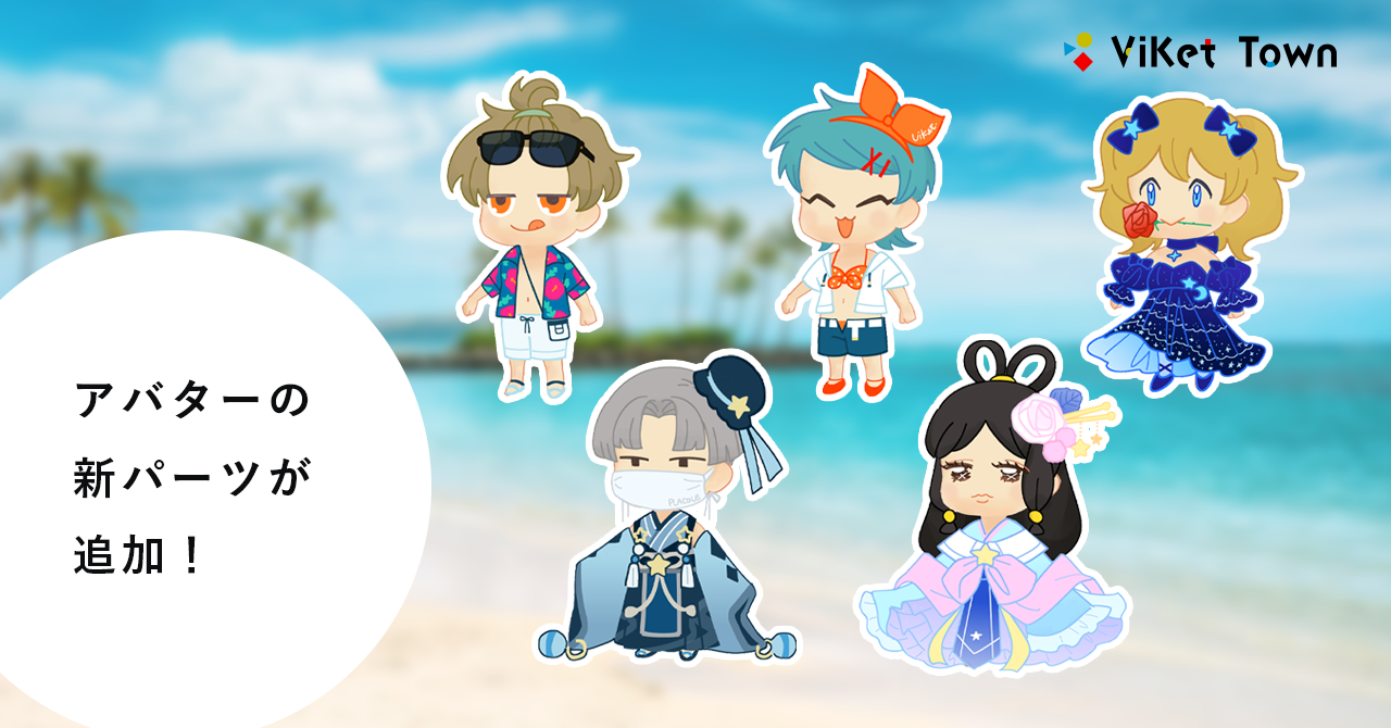 「ViKet Town(ビケットタウン)」では自分となって働くアバターが存在します。アバターには、頭、髪、目、口、服装、数種類の初期パーツから選択する事ができ、理想とする自分を生み出す事が可能です。 アバターを通してのコミュニケーションは、年齢、国籍、性別、見た目、生まれ持ったルーツによる様々な偏見をなくし、 純粋な気持ちで仲間とのプロジェクトの成功を目指す事ができます。 自分に自信がない人でも、働く新たな自分を生み出すことで、コミュニケーション能力の向上も期待でき、異空間で働くアバターは、様々なアイテムを身に着け、仲間とのコミュニケーションのきっかけともなります。今回リリースした涼しげな髪型や水着を身につけて、ハワイな世界で働きませんか?七夕に合わせた衣装や、星モチーフの衣装も登場しています。